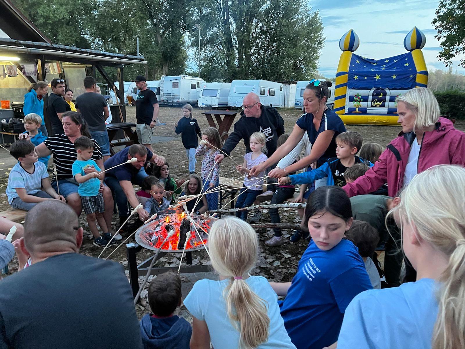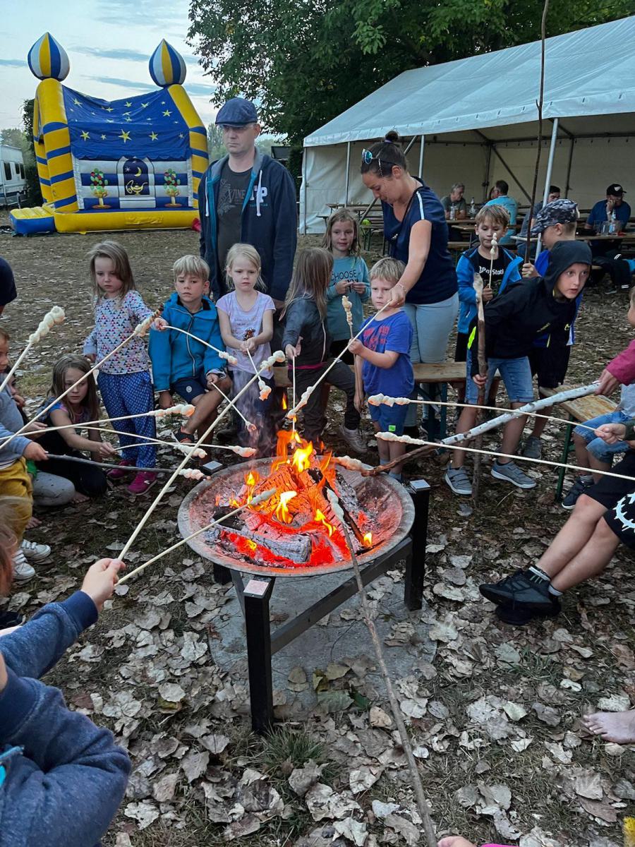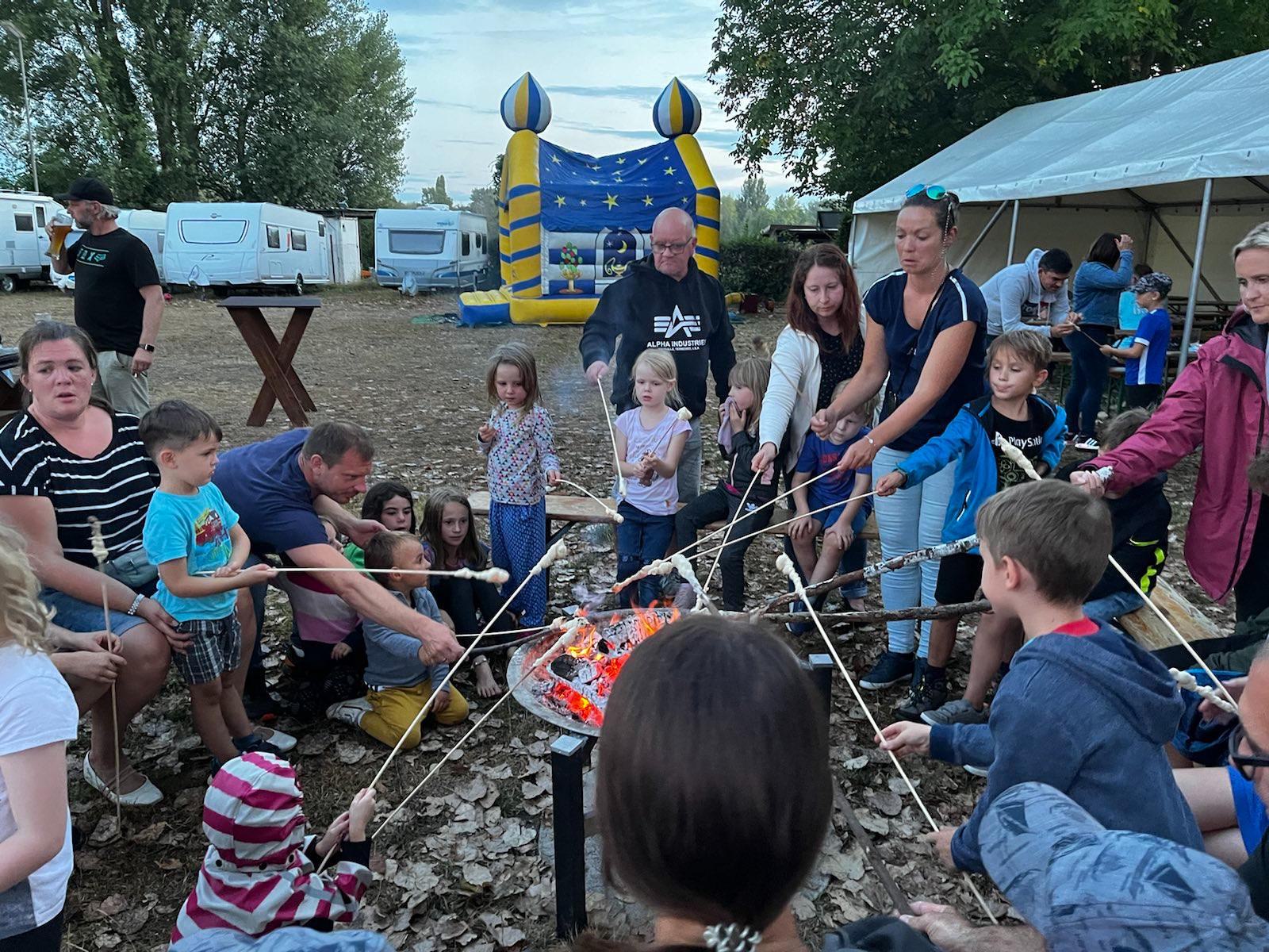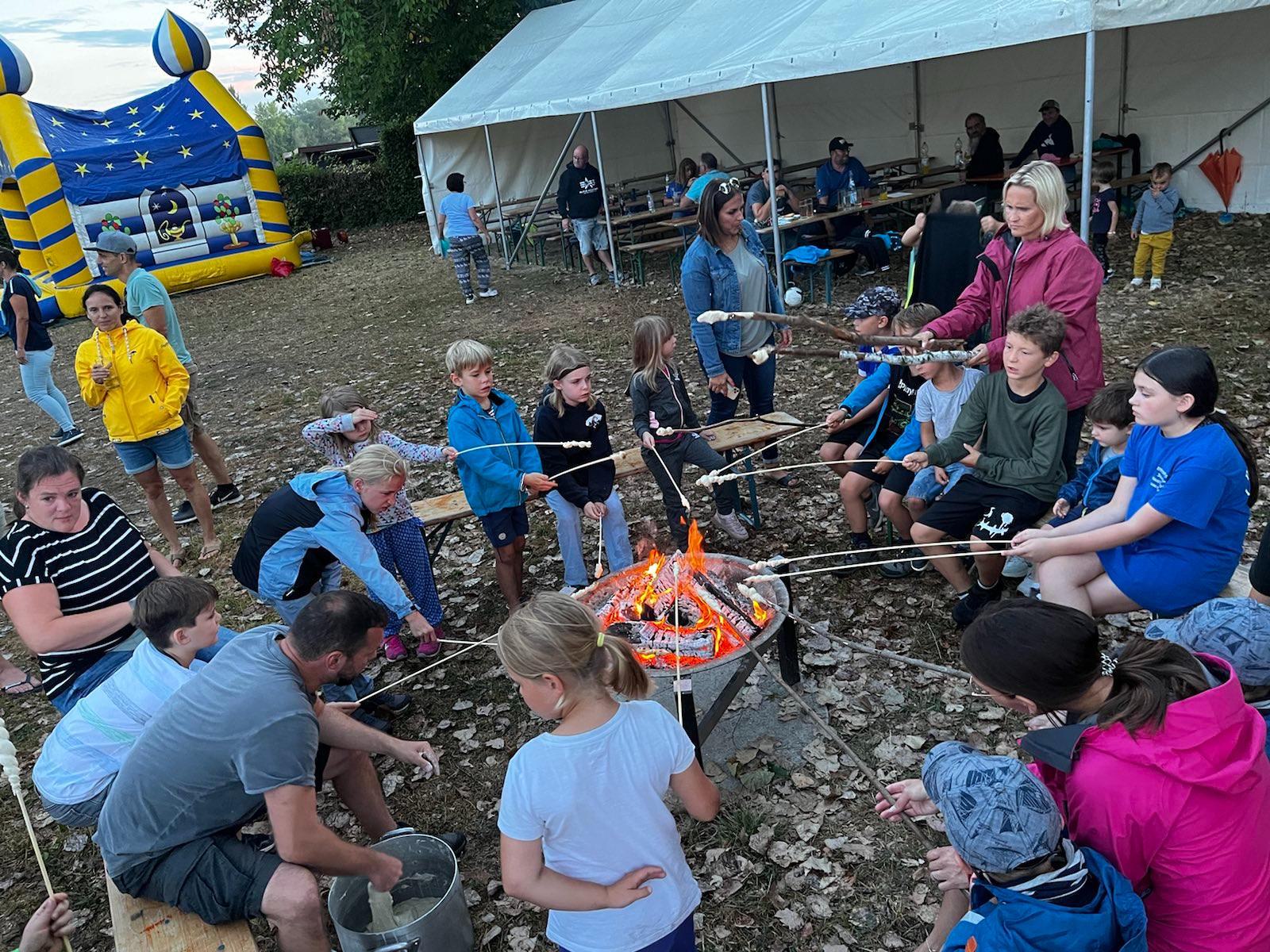 Endlich war es wieder soweit: die Zeit war reif für ein Eltern-Kind-Zeltlager. Nach zwei Jahren Corona-Pause konnte endlich wieder das beliebte Zeltlager durchgeführt werden. Ganz ohne große Werbe-Kampagne haben sich knapp 40 Kinder mit ihren Eltern auf unserem Vereinsgelände eingefunden. Das letzte Ferienwochenende hat sich als Termin bewährt. Voller Vorfreude haben die Kleinen – mit Hilfe der Eltern – ihre Zelte aufgebaut, bei freier Platzwahl. Ein Karussell und eine Hüpfburg waren wieder am Start und im Dauereinsatz. Getreu dem Motto: Raus aus dem Alltag – rein in die Natur konnte nach belieben getobt oder gechillt werden. Das gemütliche Beisammensein am Lagerfeuer war ebenso gemütlich wie die Nachwanderung stimmungsvoll war: ein ruhig dahinfließender, nebelumwobener Rhein, auf dem vor dem erleuchteten Kraftwerk ein Flusskreuzfahrtschiff dahingleitet. Was für ein Bild!