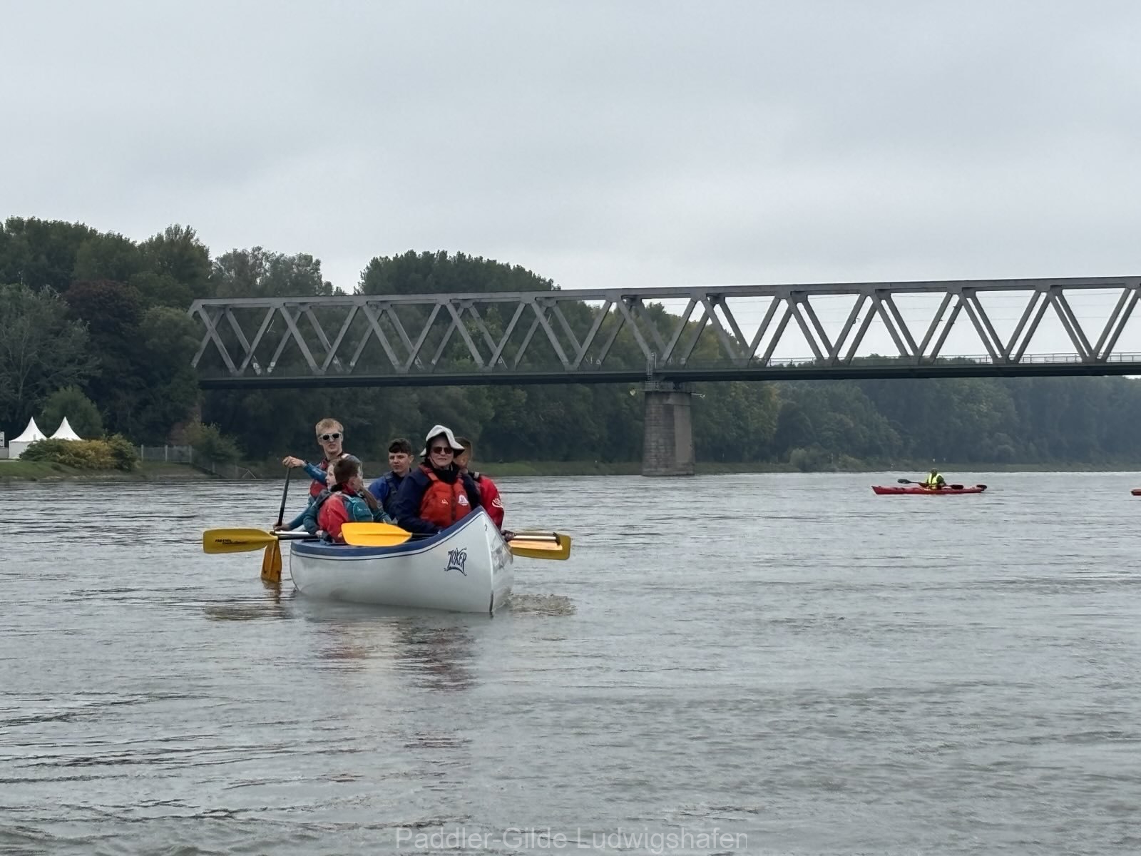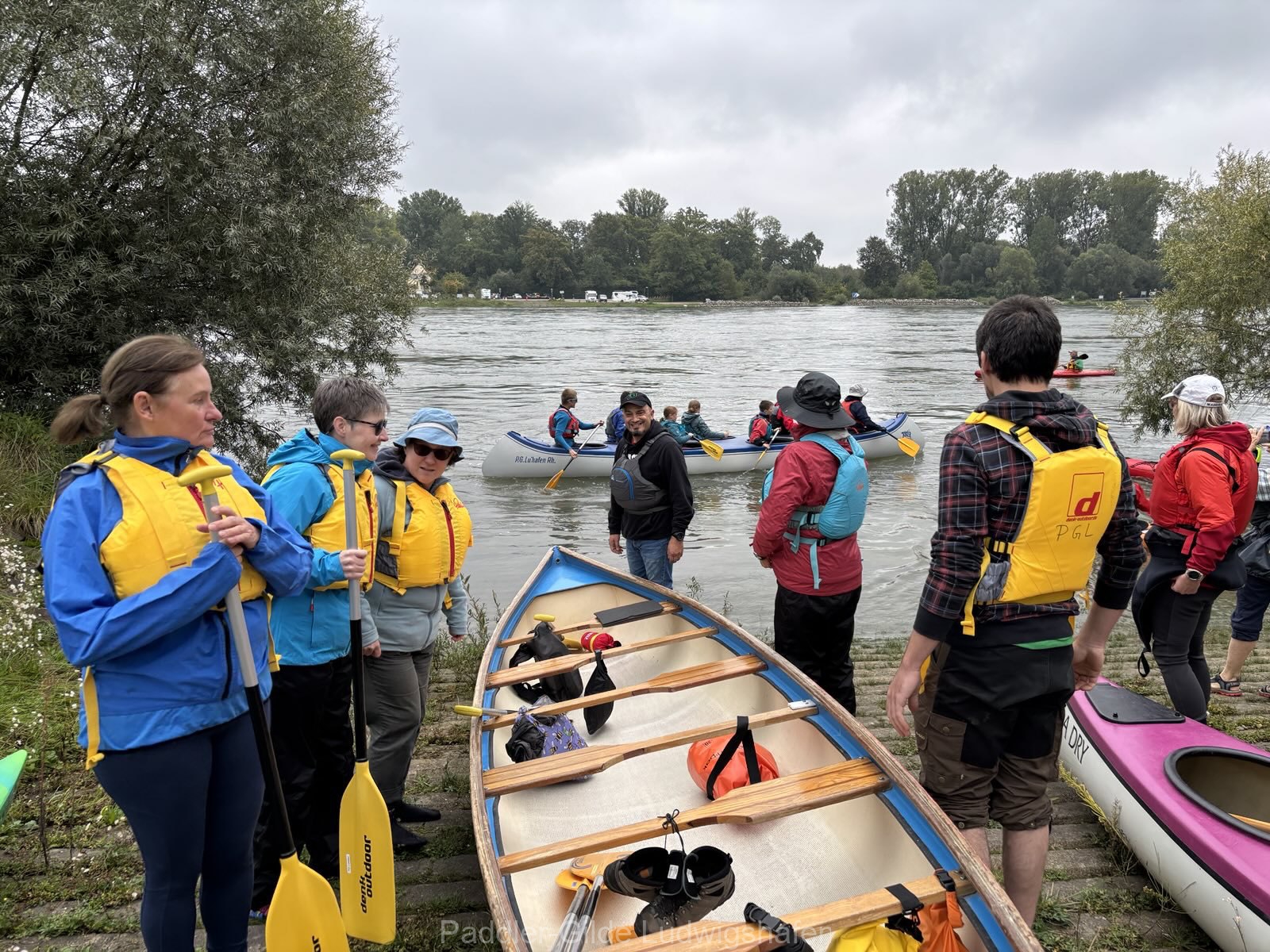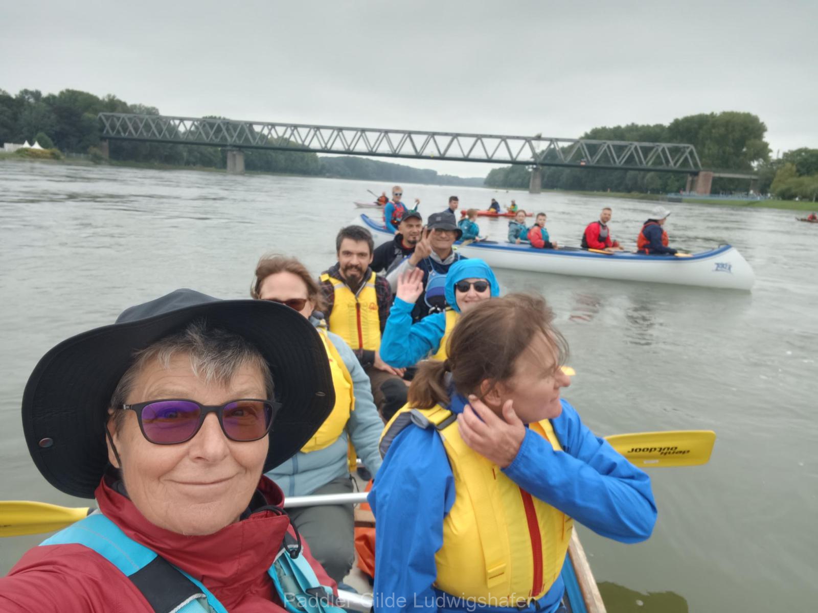Die Verbandsfahrt wurde um 11 Uhr an der Leimersheimer Fähre offiziell von der Verbandswanderwartin Claudia Lippert eröffnet. Anschließend ging es für uns aufs Wasser: Mit insgesamt 21 Teilnehmer*innen brachten wir von der PGL neben mehreren Kajaks und 2er-Canadiern auch gleich zwei Großcanadier mit jeweils sieben Besatzungsplätzen auf den Rhein.