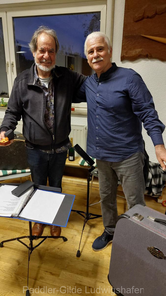 Für eine besondere Überraschung sorgte Ernst Käshammer, Mitglied der Paddler-Gilde. Er bot an, die Gäste musikalisch zu unterhalten und präsentierte gemeinsam mit Nicola Polizzano mittelalterliche Trinklieder, die von Tisch zu Tisch vorgetragen wurden. Ernst spielte die Drehleier, Nicola das Akkordeon – ein harmonisches Zusammenspiel, das die Gäste begeisterte. Für diese Darbietung gebührt besonderer Dank.